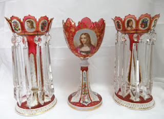 A pair of red Bohemain overlay glass lustre vases and a centrepiece with hand painted portraits, 19th century. Offered by Mayfair Antiques.